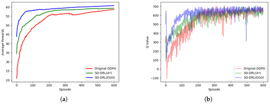 The average reward function and the average Q value for each episode of the first stage are shown in Figure 8. It can be seen that SO-DRL had a negative reward at the beginning of training and some downward floating. This is because there were already some positive and negative rewards of experience in the early stage of training, and the SO-DRL network needed to integrate with the experience and did not achieve good rewards at the early stage. However, as the training progressed, SO-DRL converged relatively faster, especially SO-DRL with EGO-Planner optimization, which was ahead of the original DDPG at 100 episodes, and SO-DRL with A* algorithm optimization, which was ahead of the original DDPG by about 220 episodes. From the performance of the final convergence, the rewards of SO-DRL reached more than 60, while the original DDPG could not break 60, and there was an obvious gap between the two in terms of rewards.
