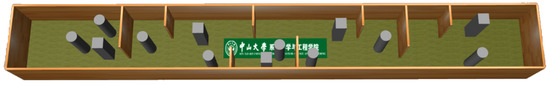We tested the methods in an environment different from the training environment. The test environment contained abundant elements, including columns, square columns, walls, etc. The test scenario was a long corridor (in Figure 10), where the agent needed to go from one end to the other and for more than 20 m.
