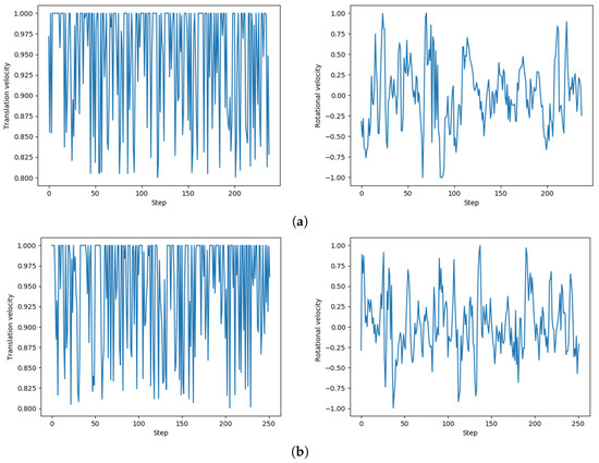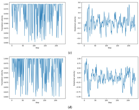 (a–d) Four sets of translational velocity and rotational velocity distribution of successful path planning in the test, which is the output value of the actor network.
