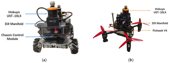 We designed a UGV and a UAV for SO-DRL for the flight experiments (in Figure 12). The UGV (in Figure 12a) was built equipped with McNamee wheels. The UAV (in Figure 12b) consisted of a flight controller Pixhawk V4 on a custom carbon fiber board with a 410 mm diagonal wheelbase. Both the UGV and the UAV mounted DJI Manifold 2-C on-board computer and used a Hokuyo UST-10LX laser scanning survey with 270 degrees for sensing.