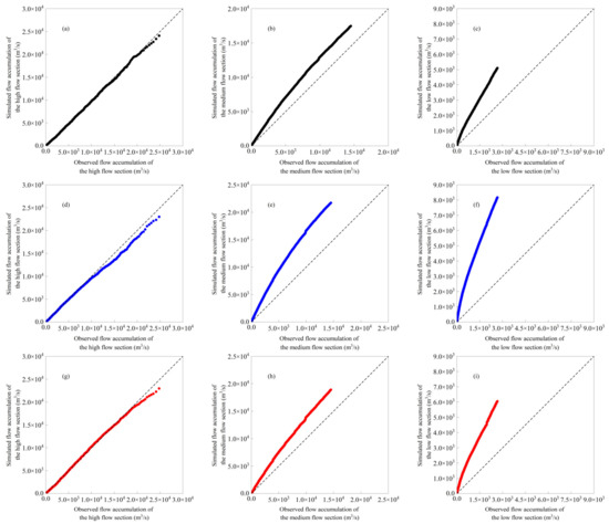 Figure 6 depicts the comparison of flow accumulation curves of three TOPMDEL models simulating different levels of flow. When the curve shown in Figure 6 was closer to the diagonal (that is, the dotted line in Figure 6), it indicated that the simulation was preferable, and vice versa. As seen from Figure 6, no matter the TOPMODEL model in question, the distance between the curve and the diagonal became larger from left to right. This shows that the simulation effect of the TOPMODEL model was better in the high-flow section, and the simulation effect worsened with the decrease in flow. In the high-flow part, it can be seen from Figure 6a,d,g that the distance between the simulated data and the diagonal line was not much different, indicating that the simulation effect of the FTOP model was similar to that of NTOP model and ITOP model. In the middle-flow section, the distance between the black line and the diagonal was smaller than that between the blue line and the red line, indicating that the simulation of the FTOP model was slightly better than that of the NTOP model and the ITOP model. The FTOP model performed similarly in the low-flow section, and the improvement was pronounced.