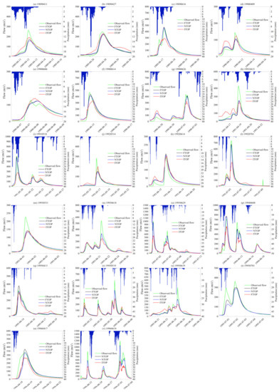 (2) For the hour-scale simulation results, the data of 22 floods in Chengcun hydrological station were used to calibrate and verify the results, and the time step was 1 h. Among them, the first 12 flood data were utilized as calibrating data, and the last ten were used as verifying data.
