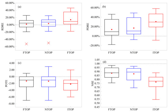 Figure 4 compares the simulated flow and the observed flow of the FTOP model, NTOP model, and ITOP model. It can be seen from Figure 4 that the simulated flow curve of the FTOP model fit well with the observed flow curve. Especially in low annual flow, the advantages of the FTOP model were more prominent. At the same time, we can also see that the performance of the NTOP model was the worst among the three TOPMODEL models. Figure 5 illustrates the scatter plots of observed flow and simulated flow of the FTOP model, NTOP model, and ITOP model. When the scatter shown in Figure 5 was closer to the diagonal (that is, the dotted line in Figure 5), it indicated that the simulation was preferable and vice versa. Compared with the NTOP model and ITOP model, it can be seen that the scatter points of the FTOP model were uniformly distributed on both sides of the diagonal, which indicated that the simulation effect of the FTOP model was better than that of the NTOP model and ITOP model.
