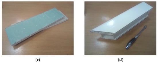 Another experience in magnetic susceptibility studies was related to the installation and development of the Gyulagarak observatory [], IAGA code GLK, located in Armenia, in collaboration with the A. Nazarov Institute of Geophysics and Engineering Seismology of the National Academy of Sciences of the Republic of Armenia (IGES NAS RA). It was proposed to use some new composite materials for the pavilion construction and especially for the exterior finish of the pavilions, as the observatory is located in a mountain region where abrupt weather changes can take place, and wooden exteriors could soon become worn due to weather impact. Therefore, it was decided to use wood for the construction of the interiors of both absolute and variation pavilions, as well as for the construction of the inner chamber of the variation pavilion. In turn, according to the project, the frames of the pavilions were supposed to be assembled from plastic C-shape channel bars joined with aluminum rivets (Figure 3a). For the outer walls, it was planned to use plastic with polypropylene and mineral wool fill (Figure 3b) and underlying pumice blocks (Figure 3c). For window frames, we intended to use plastic profiles (Figure 3d).