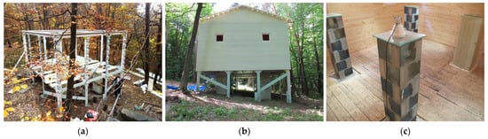 The construction process of the absolute pavilion is displayed in Figure 4a. Figure 4b shows an absolute pavilion of the GLK observatory as an example of the use of the mentioned materials, and Figure 4c shows the interior of the absolute pavilion. As seen in Figure 4c, three measurement pillars were made of glass bricks; the fourth one is experimental, and it was assembled from plastic parts. Further, we will see the advantages or disadvantages of this pillar and evaluate its stability.