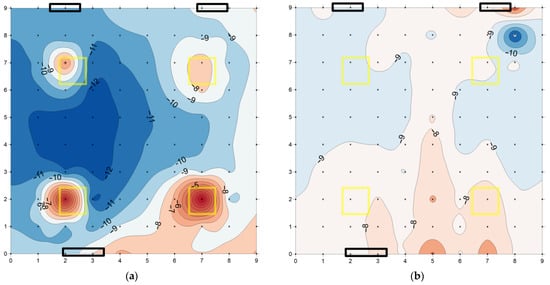 The magnetic anomaly maps for the absolute pavilion can be seen in Figure 5a (1st level) and Figure 5b (2nd level). As seen, the 1st level survey (Figure 5a) revealed significant positive magnetic anomalies close to the floor, produced by concrete feet tops. A slight effect from them can also be seen in Figure 5b on the map of the 2nd level magnetic survey. Thus, to avoid the magnetic effect from concrete, the installation of 1.5 m glass brick columns was obviously not enough.