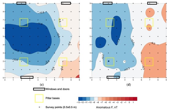Then, 0.5 m of the concrete was cut off, and the place left was filled with glass blocks. The pillar height is about 1.5 m, so the overall distance from the magnetized concrete feet to the tops of the pillars is 2 m. The new maps of magnetic anomalies in the absolute pavilion (Figure 5c,d respectively) show that the effect is negligible. We have not found the source of the anomaly in the middle of the pavilion. However, as the magnetometers will be installed high on pillars, this magnetic effect should be negligible. Moreover, we fulfill the IAGA requirements [], as the gradients between the pillars are small enough at the 2nd level. The results of a magnetic survey carried out in the variation pavilion are not displayed here, but they show similar positive anomalies above the tops of concrete feet and the absence of them after the corresponding rework.