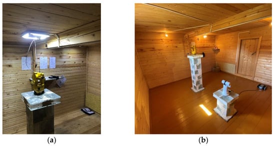 Summarizing this result, when installing the light bulbs in the absolute pavilion, it is recommended to place them on the ceiling, not right above the theodolite, but around it, close to Eastern, Western, Northern and Southern directions from the pillar in order to provide proper lighting for the theodolite limbs at the corresponding positions of the absolute measurement process without bringing disturbances close to the pillar (an example is displayed in Figure 6b). The positions and angles of the bulbs, providing the best lighting, can be adjusted during the observation of the limbs of the theodolite. In our practice, we now use non-magnetic halogen light bulbs with ceramic bases.
