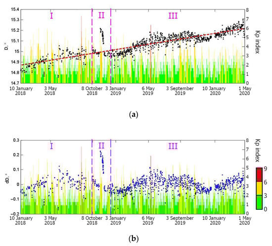 Absolute D measurements for the period of 10 January 2018–1 May 2020 for different geomagnetic conditions in the absolute pavilion of the Klimovskaya observatory: (a) Initial D plot; (b) Detrended dD plot. Right axis on both plots refers to planetary Kp index graph superimposed on D and dD plots.