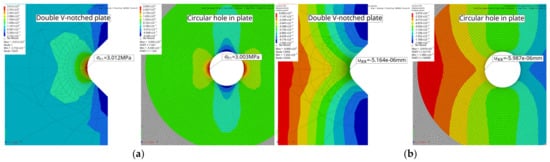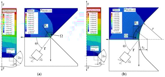 Dimensioned simulation results of a double V-notched plate (width W = 10 mm, opening angle 2α = 90°, notch depth a = 1 mm, unified tension loading): (a) Sharp notch (ρ = 0 mm); and (b) Blunt notch (ρ = 1 mm).