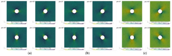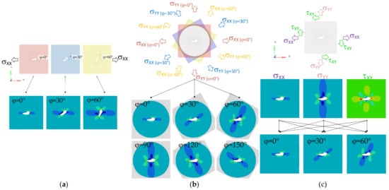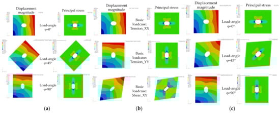 Third, the transformation equations for a mechanical stress tensor can be utilized to derive the stresses based on three principle basic load cases for each evaluated load angle . Although the number of linear–elastic simulation runs is minimized (three, in the case of planar studies), the post-processing effort is increased. This principle is hereafter denoted as Method 3 and is schematically depicted in Figure 2c. With varying load angle in the plane system, the resulting stress tensor is obtained by superposition of the three basic load cases; namely, unified tension loading in the x-axis, tension in the y-axis, and shear in the xy-plane. The stress transformation equations to transform a plane coordinate system by an angle into the rotated system have been previously detailed in mechanical handbooks [67]. As only uniaxial loading under varying load angle is considered in this study, Equation (6) details the scale factors for tension load in the x-axis , tension load in the y-axis , and the shear load . For example, if the uniaxial load vector is inclined by 45 degrees, all three load scale factors equate to one half. The transformation equations are applied to load angles up to 180 degrees in the uniaxial load study.