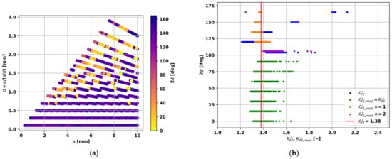 In addition, the equivalent quadrilateral cell size of the attached elements for each defect node must be known to apply the peak stress method (Equation (2)). As noted in the introduction, the peak stress method is strictly applicable only for notch opening angles up to . However, defects with a circular or elliptical shape possess arc-length sections with opening angles up to , or even higher (e.g., in the case of changing from a concave to a convex local shape of the surrounding base material). For the application of the N-SIF method to irregularly shaped defects, convex opening angle values are, therefore, limited to the boundary case as a straight line. Thus, the referred peak stress database in [40] must be extended towards larger opening angles. To check the applicability of the peak stress method for sharp notches, a numerical study using a double V-notched plate under tension was conducted. The scripted parametric study was based on linear–elastic analysis using Ansys® Build 21.1, invoking the gRPC-interface [68], wherein the notch stress intensity factor was based on the boundary value , evaluating the stress field along the bisector path. The quadratic element type PLANE183 was utilized, and key options were set according to whether plane strain or plane stress analysis was considered. The peak stress value was based on linear elements and, so, the PLANE182 element type was assigned. The peak stress results are directly comparable to the PLANE42 elements used in [40]. The conducted analysis used the same plate geometry with a thickness of , but we extended the parametric range of the notch opening angle up to in 12 steps, notch depth range in 98 steps, and the local notch tip mesh size to in 15 steps. A limit value of was considered in this study, thus reducing the number of parametric data points to for each load angle. In total, about peak stress method simulation runs were performed (Figure 3). It was confirmed that the non-dimensional ratio was well-applicable for opening angles up to , if nodal stress results are evaluated. As the observed deviations were more distinctive at notch opening angles , we concluded a dependency of the new correction factor on the second eigenvalue , as manifested in Equation (8), as this value was non-singular for values above . In addition, it was found that, for large opening angles, the number of elements at the notch tip is reduced by automatic free-meshing algorithms; thus, the number of elements at the notch tip, from notch edge to bisector line, must also be addressed. The known value characterizes the opening angle as a non-dimensional parameter.