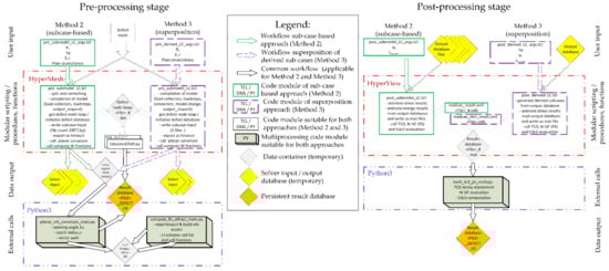 In the post-processing stage, in the case of the sub-case approach (Method 2 as shown in Figure 2b), mainly the fatigue post-processing module ‘tools_tcd_ps_esed_main.py’ must be called. However, if the superposition of derived results is chosen as an approach (Method 3, Figure 2c), the derived sub-cases must be generated first by the three basic load steps, using the introduced transformation equations. The enlarged dataset is used for fatigue post-processing. This fatigue post-processing code module is independent of the chosen evaluation method (highlighted in Figure 4 as a common code block).