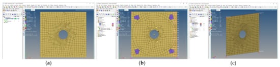 Setup of finite element models for both methods based on the same input mesh (circular hole-in-plate; referenced input mesh ‘circle_lin_R1mm_v1’): (a) Planar input mesh-pattern; (b) Re-meshed sub-case model with boundary conditions; and (c) Model of superposition method with boundary conditions and connectors.