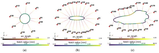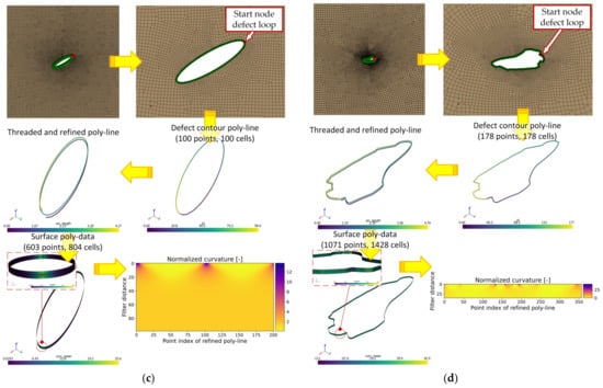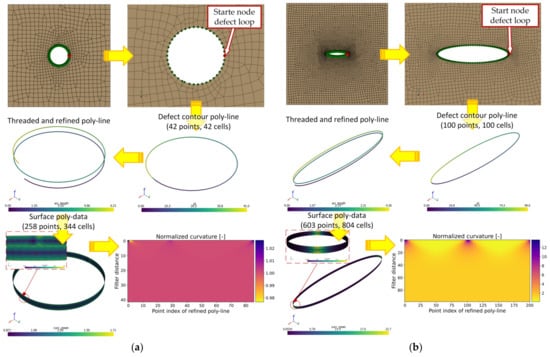 In the pre-processing stage, only the planar mesh containing the defect contour is needed as a user input for both methods. This first stage—executed by running either the Tcl script ‘pre_submodel_LC_args.tcl’ or ‘pre_derived_LC_args’—processes the workflow depicted in Figure 4 automatically. During the scripted pre-processing in HyperMesh®, the finite element model is completed: according to the specific requirements of each chosen method, the solver input files are written, and evaluation of the planar curvature and computation of control volume element fractions are also performed for each point along the defect circumference.
