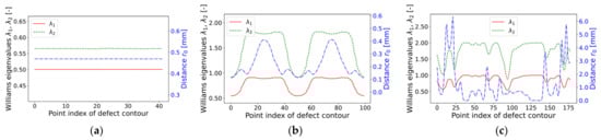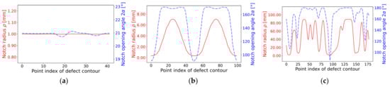 The pre-processing stage takes as input only a planar mesh depicting the imperfection (or the imperfection network) to be assessed. Of course, the quality of the input mesh must first be checked to avoid distorted mesh elements with negative Jacobian. The automated workflow for each method is called by a main Tcl wrapper script, which allows one to set up global variables before starting the automated evaluation. In pre-processing, the input variables are the value of the critical radius , which is related to the El Haddad length and plane model formulation, the material properties (in terms of Young’s modulus and Poisson’s ratio ), a flag to enable multi-processing of user-defined Python 3™ routines, and a flag to distinguish between plane strain and plane stress conditions. In addition, in the case of the sub-case approach (see Method 2 in Figure 2b), the value of the load angle increment must also be defined.