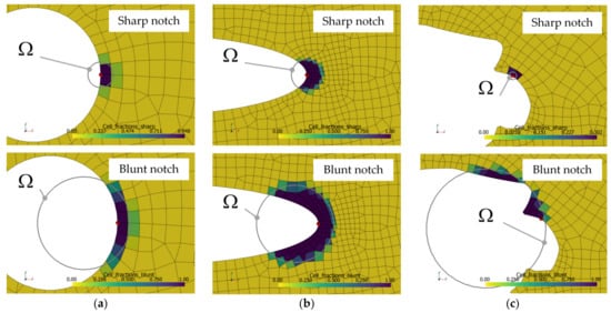 The discretized geometry of any arbitrarily shaped planar defect must be assessed for each point along the defect circumference, which can be either treated as sharp V-notch, assuming a small notch root radius (see Equation (1)), or as blunt V-notch for larger root radii, implying a stress evaluation ahead of the notch tip (Equation (3)). The stress field in the vicinity of sharp and blunt V-notches was evaluated as a basic reference example, as detailed in Table 1. In addition to the numerical results, the published analytical formulae for N-SIF and ESED are included for comparison, based on matching stress paths in the vicinity of the notch tip.