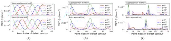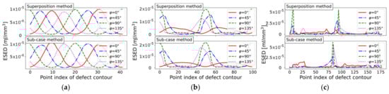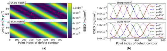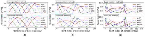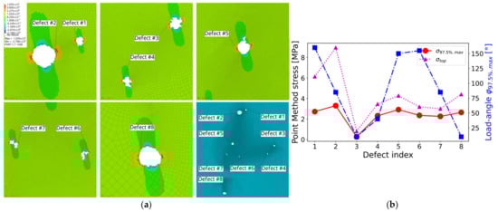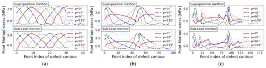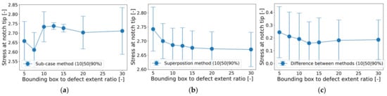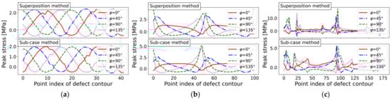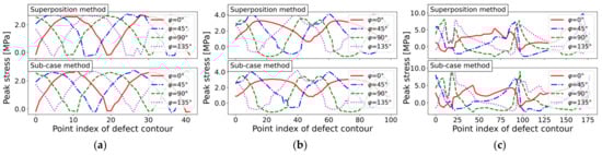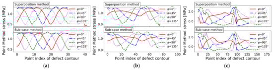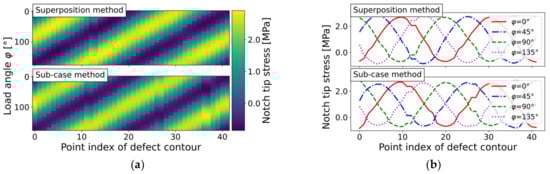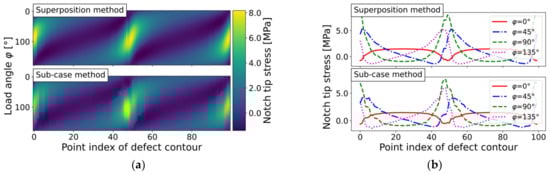 After conducting the linear analysis, the obtained output databases must be evaluated regarding local fatigue approaches; however, animations of the stress or elastic strain energy density distributions should first be recorded. The latter are not necessary for local fatigue assessment but are helpful for visualizing the change in the highly stressed volume with varying load vectors of irregularly shaped planar imperfections. Global input parameters for post-processing include the El Haddad length parameter , which is important for TCD and ESED evaluation. Next, the maximum evaluation distance of the TCD method for finite life assessment has to be set. In addition, in the case of generating the derived results by superposition (see Method 3 in Figure 2c), the chosen incremental step angle must be defined. It should be noted that both methods can use different load step angle increments; however, for comparison of the numerical efficiency between the sub-case and superposition methods, the angle step was kept equal for both methods and each study case.