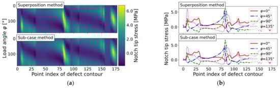 First, if the stress (or strain) field along a complex-shaped defect is to be evaluated, one of the most straightforward solutions for engineers dealing with finite element codes is to set up individual models. Uniaxial tensile loading is defined as the characteristic load case, where the load vector orientation is changing, implying the study of the stress course within a load angle range of . The principle approach of this method is sketched schematically in Figure 2a and denoted below as Method 1. If only the peak stress at the defect contour is to be evaluated, this first method is applicable. The necessary re-construction of the model can be carried out manually by the operator, or conducted in a script-based manner (e.g., using Abaqus®, Python [65], or other scripting codes). The main disadvantage of this concept is that the mesh in the vicinity of the defect is not preserved between different studies. This requires additional post-processing effort, as the evaluation nodes in the surrounding defect area are not identical for each load vector study. Thus, it is not easily applicable for stress path-dependent fatigue assessments, such as in the case of the TCD or ESED methods, as the evaluation procedure must be repeated for each single load case. For further reference, in [66], an irregularly shaped planar defect was evaluated through variation of the loading direction in the linear–elastic finite element analysis.