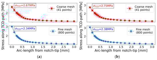 In the case of TCD evaluation, the vector paths must be computed for arc-length values up to several millimeters, significantly extending the required geometric dataset of the notch opening angle and notch radius, as previously defined for N-SIF evaluation only in the vicinity of the notch tip.