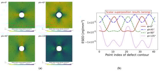If the fatigue design is to be based on ESED values, a sub-case-based approach is preferable, which allows for improved accuracy. This implies the splitting of the input model into a defect area with a circular border, which is glued to the rectangular bounding box. The latter bounding box component is rotated for each uniaxial load vector, but the interior part of the model is kept unchanged. Although an increased number of load case simulation runs is needed, the post-processing stage is simplified, as the additional transformations are omitted.