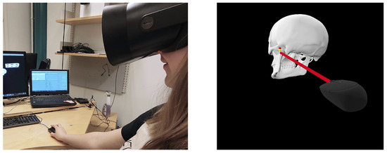 As the second interaction method, the participant used bare hands. The left hand was for object manipulation and the right hand for object marking. The participant could pick up the 3D object by a pinch gesture with their left hand, to rotate and move the object. Marking was performed with a virtual pen. In the VR environment, the participant had the virtual pen attached to their right palm, near to the index finger (Figure 2, right). As the palm was moved, the pen moved accordingly. When the virtual pen tip was close to the target, the tip changed its color to green to show that the pen was touching the surface of the object. The landmark was put on the surface by bending the index finger and pressing the pen’s virtual button. The participant had to keep their palm steady when pressing the button to prevent the pen from moving.