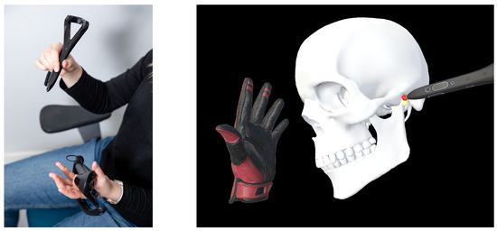 The third interaction method was based on having a controller on participant’s left hand for the object manipulation and a VR stylus on the right hand for the marking (Figure 3). The participant grabbed the 3D object with a hand grab gesture around the controller to rotate and move the object. The markings were made with the physical VR stylus. The VR stylus was visualized in VR as was the mouse, so that the participant knew where the device was located. The participant pointed at the target with the stylus and pressed its physical button to make the landmark. The act of press was identical to the virtual pen press in the hands method. There was passive haptic feedback when touching the physical VR stylus, which did not happen with the virtual pen.