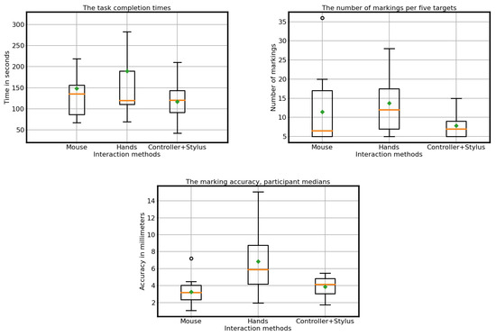 The number of markings performed before the task completion varied between the interaction methods (Figure 4, top right). The median values for the mouse, hands, and controller+stylus conditions were 6.5, 12, and 7 markings, respectively. However, there were no statistically significant differences between the mouse and hands methods ( ), between the mouse and controller+stylus methods (), or between the hands and controller+stylus methods (). The degrees of freedom was 11 in all pairs. Some participants performed many markings at a fast pace (2–3 markings per second) leading to a high number of total markings.