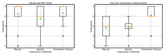 Box plot visualizations of the fatigue and daily use evaluations. The evaluation of fatigue (left): none of the methods were found to be particularly tiring. The evaluation of possible daily use (right): controller+stylus was significantly more usable for daily use than the other methods.