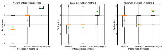 Box plot visualizations of the interaction method evaluations. The evaluation of interaction method naturalness (left), easiness (middle), and accuracy (right). Controller+stylus was the most liked method in these features. There were significant differences between controller+stylus and hands in all attributes (naturalness, easiness, and accuracy) and between controller+stylus and mouse in naturalness and easiness.