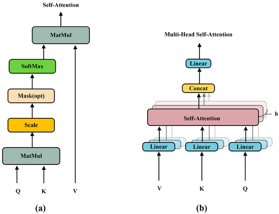 Specifically, the transformer model is still a network structure from encoder to decoder, but with the abandonment of recursion and convolution, a multihead self-attention mechanism is added to the encoder and decoder modules, respectively. The multihead self-attention mechanism is a key component of the transformer model in that the multihead attention mechanism is able to capture remote dependencies between elements and to encode interactions between sequential tokens. As shown in Figure 2b, the multihead self-attention mechanism allows the model to jointly attend to information from different subspaces at different locations. The objective of the multihead attention mechanism is to simultaneously perform multiple parallel attention functions. A single attention (Figure 2a) function can be represented as a function consisting of a query and a set of keys and values corresponding to an output, where the query, key, value, and output are all represented as vectors. The input is composed of a query and key with dimension dk and a value with dimension dv. The dot product of the query is calculated by using all the keys divided by , and the weights of the values are obtained by the function. During the calculation, the attention function of a set of queries is simultaneously computed, which is defined as a matrix Q. The keys and values are defined as matrices K and V, respectively, and the attention function can be expressed as follows: