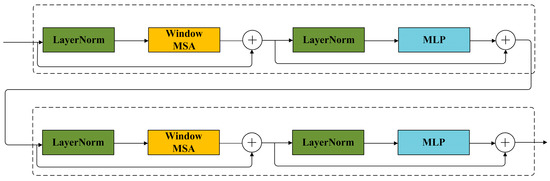 Inspired by the Unet network, SwinUnet is designed with a symmetric decoder with a patch extension layer based on the Swin Transformer. Unlike the traditional multihead self-attention (MSA), the Swin Transformer module is built based on a shifted window. Figure 6 shows the structure of the Swin Transformer module, which consists of LayerNorm (LN) layers, a multihead self-attention module, a residual connection, and a two-layer MLP with Gaussian error linear units (GELUs) nonlinearity. The window-based multihead self-attention module (W-MSA) and the translational window-based multihead self-attention (SW-MSA) module are used in two consecutive Swin Transformer modules, respectively. For such a modular composition, the continuous Swin Transformer can be expressed as follows: