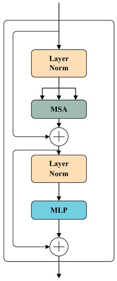 TransUnet first uses CNN as a feature extractor to generate the input feature maps. This is when the patch-embedding module extracts 1 × 1 patches from the feature map generated by the CNN, rather than from the original map. The transformer encoder in the TransUnet network consists of the L-layer MSA and MLP modules (as shown in Figure 8), so the output of the lth layer can be expressed as follows: