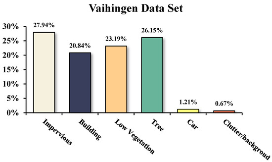 Vaihingen data set: Vaihingen is a relatively small village located in Germany with a number of detached buildings and small multistory buildings. The Vaihingen data set contains 33 remote-sensing images of different sizes covering an area of 1.38 km2 in Vaihingen. The spatial resolution of the top image and DSM is 9 cm, and each image has four bands: near-infrared, red, green, and blue. We cropped 33 remote-sensing images of different sizes into small images with a size of 224 × 224, and the cropped images were divided into a training set, a validation set, and a test set according to the ratio of 8:1:1. The percentage of each type of feature in the data set is shown in Figure 9.