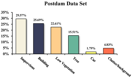 Potsdam data set: Potsdam is a city with a long history of large buildings, narrow streets, and a dense settlement structure. The Potsdam data set contains 38 remotely sensed images of the same size (6000 × 6000) covering an area of 3.42 km2 in Potsdam. The spatial resolution of the top image and DSM is 5 cm, and each image has four bands: near-infrared, red, green, and blue. Similarly, we cropped 38 remote-sensing images of the same size into small images with a size of 224 × 224, and the cropped images were divided into a training set, a validation set, and a test set according to the ratio of 8:1:1. The percentage of each type of feature in the data set is shown in Figure 10.