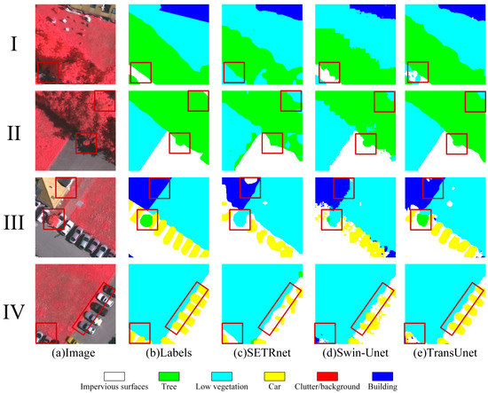 Comparison of transformer’s segmentation results in the Vaihingen data set. The red boxes are where the differences between the three network segmentations are large.