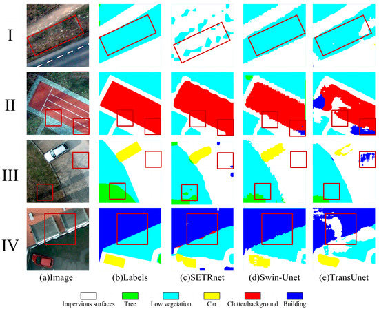 Comparison of transformer’s segmentation results in the Potsdam data set. The red boxes are where the differences between the three network segmentations are large.