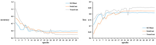 The whole training process of SwinUnet was relatively stable, the accuracy value shows a steady increase, and the loss value shows a steady decrease (Figure 13). There are fluctuations in both SETRnet and TransUnet; however, all the models converged after about the 25th epoch. Among them, fluctuations occurred at the beginning of the training for SETRnet. The final accuracy and loss values of SETRnet were the worst. TransUnet showed optimal results directly after the wave. This shows that SwinUnet is more robust and less difficult to train. The training result of TransUnet is better than the SwinUet and SETRnet models, but the training difficulty is relatively high. It is necessary to set the appropriate learning rate and simultaneously adjust the training strategy, including the epoch, learning rate decay strategy, etc.