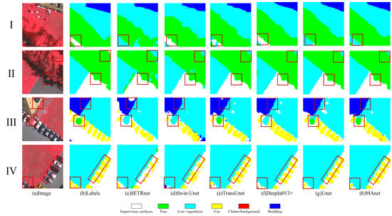 In order to better analyze the gap between the three transformer models in terms of segmentation details, partially cropped images in the two data sets were selected for the analysis of segmentation results in this study. The segmentation results of the Vaihingen and Potsdam data sets are shown in Figure 11 and Figure 12, respectively.