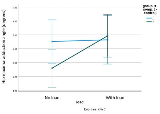 The results of the maximal joint angles during walking are summarized in Table 2. A significant difference with a large effect in the maximal angle was observed between load and no-load conditions in all examined parameters (greater in the load condition) (p < 0.05, η2p > 0.2). There was a significant large effect of the interaction between group and condition in the hip adduction angle (p = 0.029, η2p = 0.207). In the PFPS group, the mean maximal hip adduction angle was 4.51° and 4.64° without and with weight compared with 2.59° and 4.92° in the controls (Figure 3), thus implying that without load, a significant difference was found between groups, whereas while carrying a load, no difference was observed. No other differences between groups were found (p > 0.05). Although not significant, all angles were higher amongst the PFPS group compared with the controls (with and without load). No interaction between weight carrying and dominant leg or between weight carrying and leg side (left or right) was found, without differences between groups.