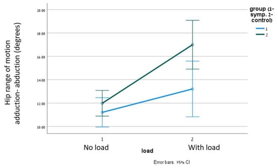 There was a significant large effect of load on hip adduction–abduction range of motion (p < 0.001, η2p = 0.600), as well as on foot pronation—supination (p < 0.05, η2p = 0.412), which demonstrated a larger range of motion during walking with a load compared with the no-load condition. No effect of load carrying was found on other measured variables (p > 0.05). There was a significant large effect of group (p = 0.041, η2p = 0.185) on adduction–abduction range of motion. This implies that the research group (PFPS) had a smaller hip range of motion. There was a significant interaction between group and condition in the hip adduction–abduction range of motion (p = 0.025, η2p = 0.217). In the PFPS group, the mean hip adduction–abduction range of motion was 11.20 (±2.13)° and 13.2 1(±2.24)° without and with weight compared with 11.98 (±1.72)° and 16.99 (±4.38)° in the controls (Figure 4). This suggests a larger adduction–abduction range of motion in the control group. No other differences were found between groups regarding joint range of motions. No interaction between weight carrying and dominant leg or between weight carrying and leg side (left or right) was found, without a difference between groups.