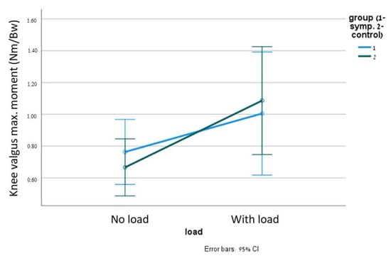 The results of the peak moments are summarized in Table 4. There was a significant large effect of load on mean peak moments in both groups (p < 0.05, η2p > 0.3), suggesting greater moments of hip adduction, hip internal rotation, knee valgus (Figure 5) and internal rotation with load. No differences between groups were observed (p > 0.05). No interaction between weight carrying and group, weight carrying and dominant leg or weight carrying and leg side (left or right) were found, without a difference between groups.