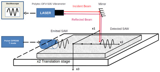 We investigated the Rayleigh wave because the monitoring of its velocity allows us to access information from the surface of the material complementary to those given by the bulk waves. The monitoring of the Rayleigh wave was thus achieved by recording the time history received at a series of equally spaced positions along the propagation path (Figure 1 [25]). At each measurement point, the laser interferometer detected a vibration signal at the surface. All the signals were then sorted in a spatio-temporal matrix with as many lines as measuring points. The Rayleigh wave velocity was then computed by finding the slope of the relative spatial displacement of the envelope with respect to its relative temporal displacement. Each sample was scanned over 400 measurement points along 40 mm in the x 2 axis (spatial step of 0.1 mm).