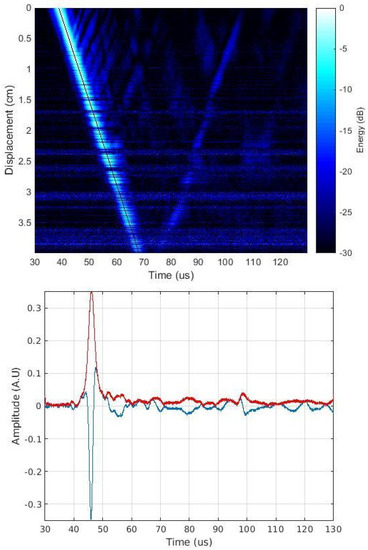 Figure 2. Spatio—temporal matrix obtained from monitoring of Rayleigh wave propagation in the OP2 sample (above). For x = 1 cm, the signal (blue) and its envelope (red) are shown (below).