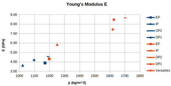 In Figure 3, two groups of materials can be also distinguished: those with low and high density, correlated with low and high Young’s modulus, respectively. The latter group had a remarkable Young’s modulus with an average value of 8.2 GPa (average density of 1650 kg·m−3). In the case of the orthophthalic resin composite OP2, the measured properties were compatible with a Versailles reference sample [1]. This was expected as the resin type and proportions were the same for both samples. From these results, it was also observed that the isophthalic resin composite IP had comparable mechanical properties to OP2. Otherwise, the properties of the orthoptalic resin composite OP1 were closer to those of the low density group. This may have been due to the fact that the proportions of metamorphic rock filler was lower than in the case of OP2 and IP [3].