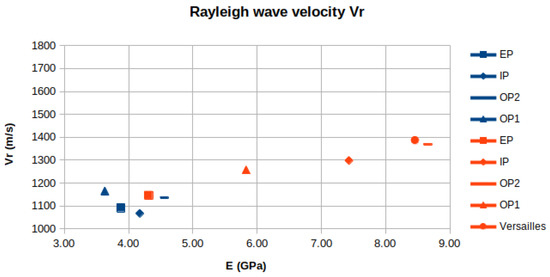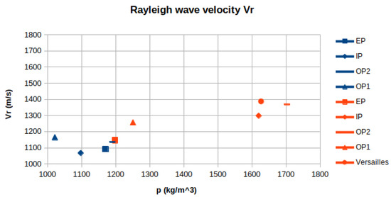 For the different types of composites, Figure 4 and Figure 5 make it possible to compare the average Rayleigh wave velocity against the density and Young’s modulus, respectively. As previously mentioned, Figure 4 makes it possible to isolate the group of resins specific to the polyester/marble composites, such as those used in Versailles (which would be useful for identification and classification in nondestructive testing). Finally, in Figure 5, a directly proportional relationship between the Rayleigh wave velocity and the Young’s modulus is observed for all the composites. In the case of polyester resins, this latter representation allows us to state that Rayleigh wave velocity and Young’s modulus both increase as the filler mass fraction increases, even for the orthophthalic resin composite OP1 (whose filler mass fraction was less than 30%), which is in between the pure polyester and polyester/marble composites (50% filler). Based on the mechanical property measurements presented here, it seems more appropriate to use OP2 resins for gelcoat (pure) and imitation marble (with 50% filler) applications. Though it is not the subject of this paper, this material is also compatible from an aesthetic point of view for the needs of restoration (visual aspect, no yellowing over time, etc.).