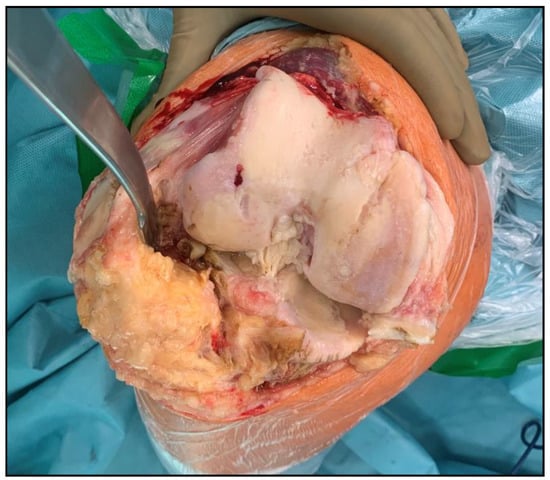 Osteoarthritis of the knee joint; in the upper part of the figure, femoral condyles are seen with major osteoarthritic changes. In the lower part, the tibial plateau (partially) is seen. Source: proprietary material, intraoperative photograph.