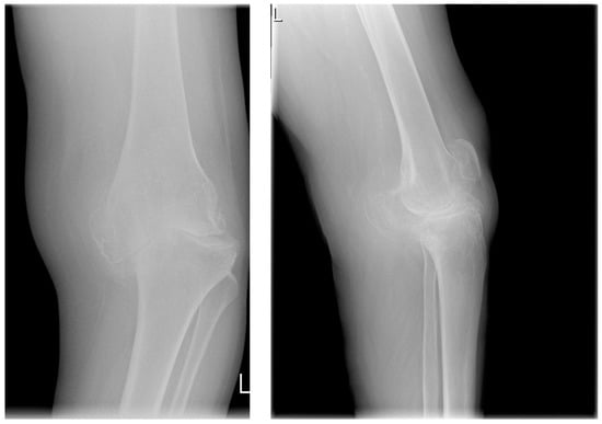 According to the classification of Kellgren, Lawrence, and Crofty-Lane, a classic X-ray examination, which is most often performed in anterior–posterior and lateral projections, defines the disease at the stage of advanced cartilage defects, which lead to secondary changes in the joint (Figure 2).