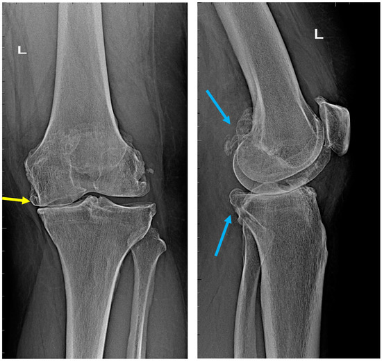 Radiographs of the knee joint. Grade-4 arthrosis on the K–L scale, grade 3 on the Crofty-Lane scale. Left—AP view, right—lateral view. Visible (yellow arrow) complete narrowing of the joint space in the medial compartment, numerous osteophytes (blue arrows), and joint-axis disorders. Upper part: femoral bone, lower part: tibia and fibula. Source: proprietary material.