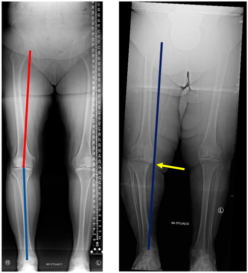 Measurement X-ray of the lower limbs in a patient with a slight varus deformity of the knee joint (left) and an advanced deformity (right). On the left, HKA angle is presented: red line shows hip–knee line; blue line shows knee–ankle line. On the right: narrowing of the medial compartment (yellow arrow) affecting the mechanical axis of the limb (blue line). The line moved medially indicates varus deformity of the knee joint. Source: proprietary material (description “na stojąco” [pl] means in the weightbearing position).